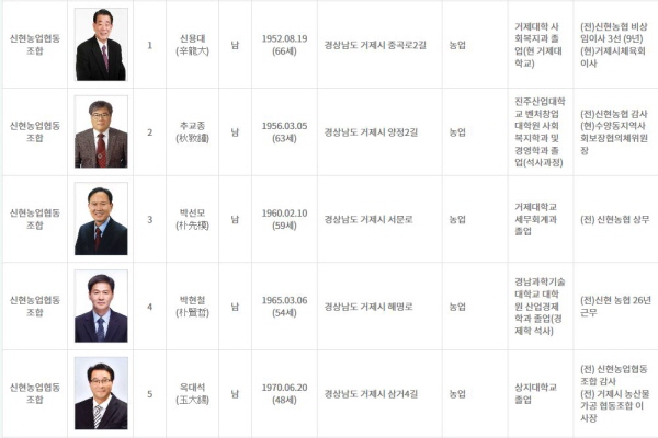 ½ÅÇö³óÇù Á¶ÇÕÀå ¼±°Å´Â ±âÈ£ 1¹ø ½Å¿ë´ë(66) Àü ½ÅÇö³óÇù ºñ»óÀÓ°¨»ç, ±âÈ£ 2¹ø Ãß±³Á¾(63) Àü ½ÅÇö³óÇù °¨»ç, ±âÈ£ 3¹ø ¹Ú¼±¸ð(59) Àü ½ÅÇö³óÇù »ó¹«, ±âÈ£ 4¹ø ¹ÚÇöö(54) Àü ½ÅÇö³óÇù Á÷¿ø, ±âÈ£ 5¹ø ¿Á´ë¼®(48) Àü ½ÅÇö³óÇù °¨»ç°¡ °Ýµ¹ÇÑ´Ù.