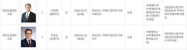 ÀÏ¿î³óÇù Á¶ÇÕÀå ¼±°Å´Â ±âÈ£ 1¹ø Á¶¿µ·¡(62) Àü ÀÏ¿î³óÇù Àü¹«, ±âÈ£ 2¹ø À̼º±Õ(56) Àü ÀÏ¿î³óÇù Àü¹«°¡ ÀÏÀüÀ» Ä¡¸¥´Ù.