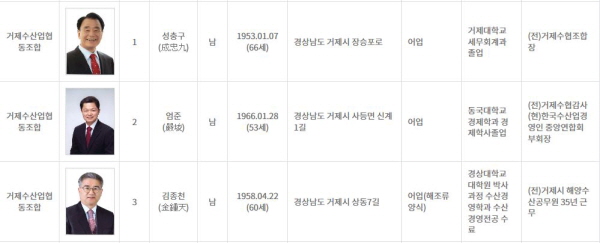 °ÅÁ¦¼öÇù Á¶ÇÕÀå ¼±°Å´Â ±âÈ£ 1¹ø ¼ºÃ汸(66) Àü °ÅÁ¦¼öÇùÁ¶ÇÕÀå, ±âÈ£ 2¹ø ¾öÁØ(53) Çö Çѱ¹¼ö»ê¾÷°æ¿µÀÎ Áß¾Ó¿¬ÇÕȸ ºÎȸÀå, ±âÈ£ 3¹ø ±èÁ¾Ãµ(60) Àü °ÅÁ¦½Ã ±¹ÀåÀÌ ÀÚ¿õÀ» °Ü·é´Ù.