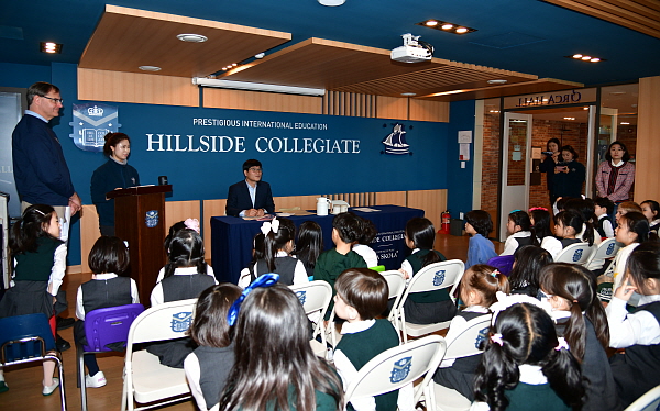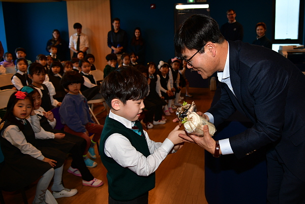 À̾î Çб³·Î°í°¡ ±×·ÁÁø ÅÒºí·¯ ¼±¹°À» ÁõÁ¤ÇÏ´Â ½Ã°£À» °¡Áö°í ±³Á÷¿ø, Çлýµé°ú ÇÔ²² ±â³äÃÔ¿µÀ» Çß´Ù