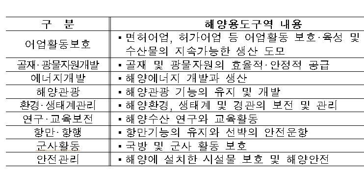 ÇØ¾ç¿ëµµ±¸¿ªÀ» ÁöÁ¤Çϱâ À§ÇØ ÇØ¾ç°ø°£¿¡¼ ÀÌ·ç¾îÁö°í ÀÖ´Â °¢Á¾ Ȱµ¿ÀÇ ÇöȲ°ú Á¤µµ¸¦ Æò°¡Çϰí, ÀÌ Æò°¡ °á°ú¿Í ÇÔ²² ´Ù¸¥ ¹ý·ü¿¡¼ ÁöÁ¤ÇÑ °ü·Ã ¹ýÁ¤±¸¿ªÀ» °í·Á, ÇØ¾ç¿ëµµ±¸¿ª(¾È)À» ¸¶·ÃÇÑ´Ù.