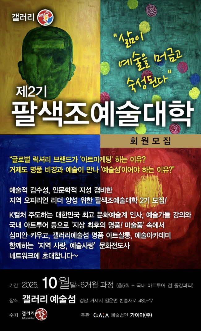 1±â¿¡ ÀÌ¾î ¡°»îÀÌ ¿¹¼úÀ» ¸Ó±Ý°í ¼÷¼º¡±µÇ´Â 2±â ¡®ÆÈ»öÁ¶ ¿¹¼ú´ëÇС¯Àº °¶·¯¸®¿¹¼ú¼¶ ÁÖÃÖ, ¿¹¼ú¹ýÀÎ °¡À̾Æ(ÁÖ) ÁÖ°üÀ¸·Î 10¿ù ¸»ºÎÅÍ ¸Å¿ù ³Ý°ÁÖ ¸ñ¿äÀÏ ¿ÀÈÄ 2½Ã¿¡ ¿ ¿¹Á¤ÀÌ´Ù.