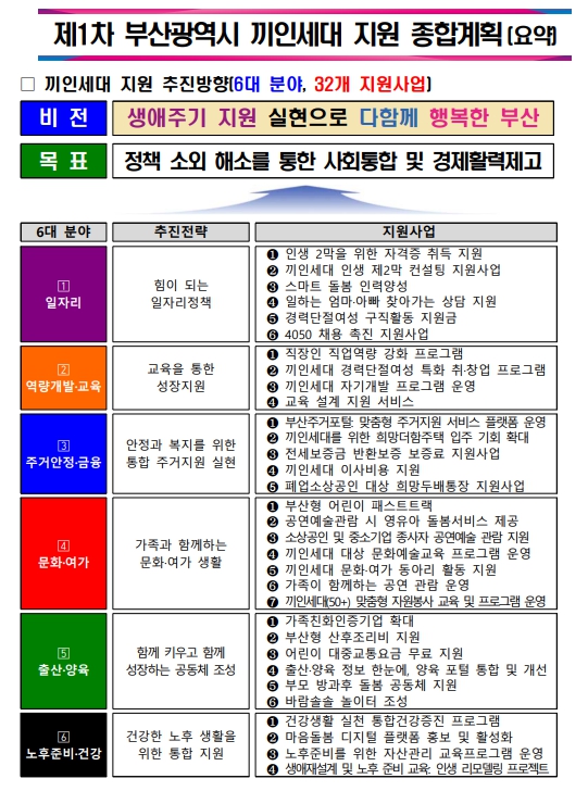 Á¾ÇÕ°èȹÀº '»ý¾ÖÁÖ±â Áö¿ø ½ÇÇöÀ¸·Î ´ÙÇÔ²² ÇູÇÑ ºÎ»ê'À» ºñÀüÀ¸·Î ¡ãÀÏÀÚ¸® ¡ã¿ª·®°³¹ß¡¤±³À° ¡ãÁְžÈÁ¤¡¤±ÝÀ¶ ¡ã¹®È¡¤¿©°¡ ¡ãÃâ»ê¡¤¾çÀ° ¡ã³ëÈÄÁغñ¡¤°Ç°ÀÇ 6´ë ºÐ¾ß¿¡ 32°³ Áö¿ø»ç¾÷À¸·Î ±¸¼ºµÈ´Ù.