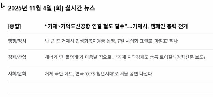 2025³â 11¿ù 4ÀÏ ¾ð·Ð¿¡ º¸µµµÈ °æ³² °ÅÁ¦½ÃÀÇ ÁÖ¿ä ¼Ò½ÄµéÀº Áö¿ª Çö¾È °ü·Ã ½ÃÁ¤ Ȱµ¿, °æÁ¦ Ȱ¼ºÈ¸¦ À§ÇÑ ³ë·Â, ±×¸®°í »çȸ/¹®È ºÐ¾ßÀÇ Çà»ç ¼Ò½ÄÀ¸·Î ¿ä¾àµË´Ï´Ù. ºÐ¾ßº° ÁÖ¿ä ³»¿ëÀº ´ÙÀ½°ú °°½À´Ï´Ù.