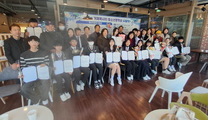 °ÅÁ¦ºÏ½ÃƼ¹®ÇлóÀ§¿øÈ¸(Á¦Á¤ÀÚ ¿ÁÁؼ®)°¡ °ø¸ðÇÑ Á¦6ȸ °ÅÁ¦ºÏ½ÃƼû¼Ò³â¹®Çлó ½Ã»ó½ÄÀÌ 13ÀÏ »óµ¿µ¿ ºÏ½ÃƼ¼Á¡ 2Ãþ¿¡¼ ¼ö»óÀÚ¿Í °¡Á·, ³»ºó µî 50¿© ¸íÀÌ Âü¼®ÇÑ °¡¿îµ¥ ¿·È´Ù.