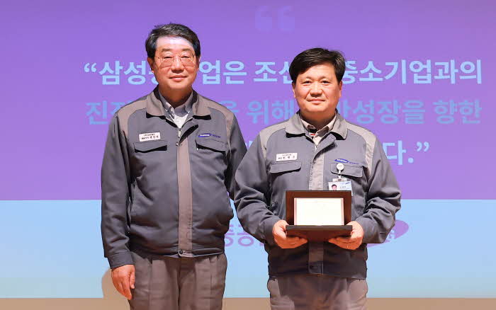 »ï¼ºÁß°ø¾÷ Çù·Âȸ»ç ÇùÀÇȸ À±Áø¼® ȸÀå(»çÁø ÁÂÃø)ÀÌ »ï¼ºÁß°ø¾÷ õ¸íÁØ ±â¼ú¿¬¼ö¿øÀå(»çÁø ¿ìÃø)¿¡°Ô °¨»çÆÐ¸¦ Àü´ÞÇϰí ÀÖ´Ù.